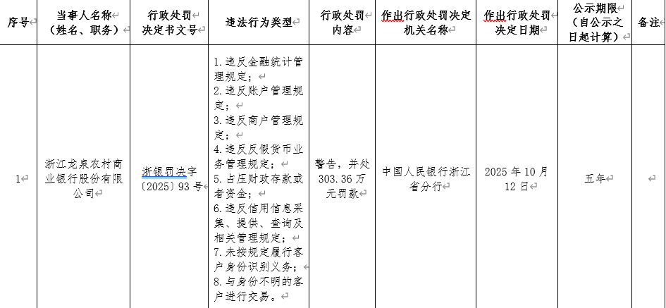 浙江龙泉农村商业银行股份有限公司因涉及八项违法行为,包括违反金融统计、账户、商户、反假货币业务管理规定;占压财政存款;违反信用信息相关规定;未履行客户身份识别义务;与身份不明客户交易,被处以警告并处303.36万元罚款。