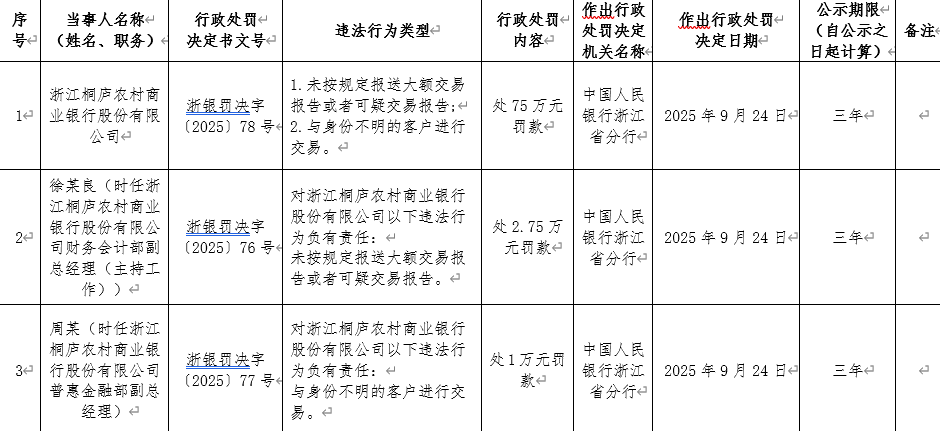浙江桐庐农商行因反洗钱违规被罚75万元,两负责人同时追责