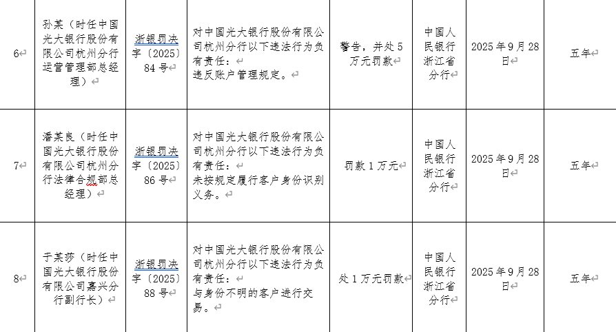 根据中国人民银行浙江省分行于2025年9月28日作出的行政处罚决定(文号:浙银罚决字〔2025〕80-84,86-88号),中国光大银行股份有限公司杭州分行及其七名相关责任人因存在多项违法行为被处以行政处罚,公示期限均为五年。具体处罚情况如下: