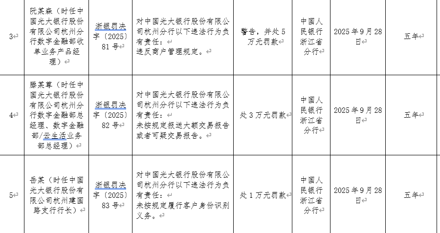 岳某(时任杭州建国路支行行长):对未按规定履行客户身份识别义务的行为负有责任,被处以1万元罚款(浙银罚决字〔2025〕83号)。