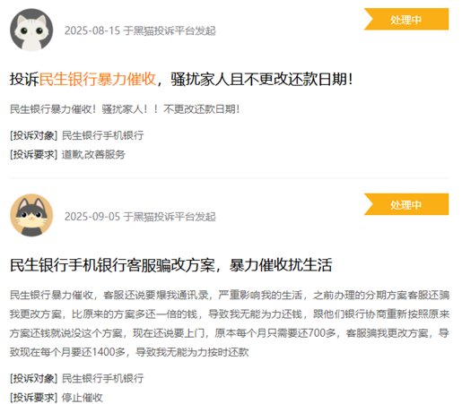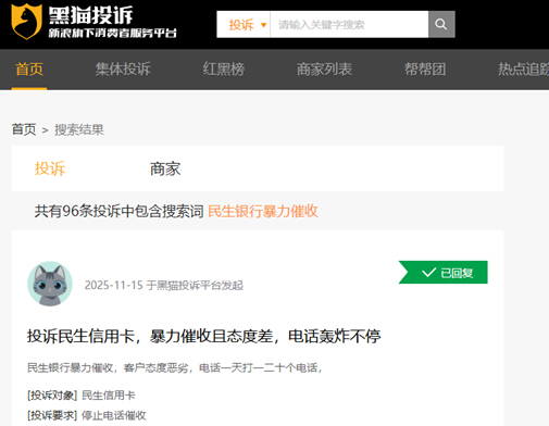 公开投诉信息显示,民生银行此前在催收环节曾面临一定争议。根据黑猫投诉平台数据,涉及该行“暴力催收”的相关投诉累计已近百条,投诉内容多涉及频繁电话骚扰、联系借款人家属等第三方催收行为。