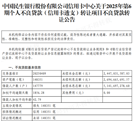 近日,民生银行信用卡中心在银行业信贷资产登记流转中心(简称“银登中心”)挂出2025年第6期个人不良贷款(信用卡透支)资产包的转让公告。