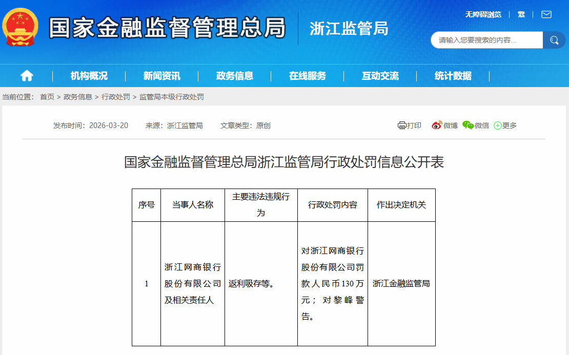 浙江网商银行因“返利吸存”等违规行为被罚130万元