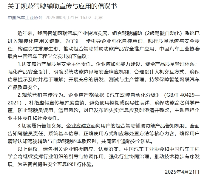 以上倡议,请各相关企业积极响应、认真落实。中国汽车工业协会和中国汽车工程学会将继续发挥行业组织的引导与协调作用,强化行业协同治理,推动技术稳步有序发展,为消费者提供安全可靠的出行体验。