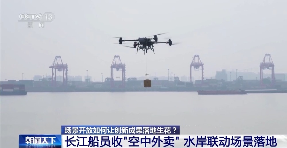 场景开放的红利,不仅体现在产业升级中,更渗透到民生保障的细微之处,尤其是在特殊场景的需求满足上。在长江南京段的水面上,一架搭载着新鲜果蔬、快餐等物资的无人机,精准飞向正在航行的船舶。抵达目标上空后,AR定位技术自动锁定甲板投放点,平稳将“水上外卖”吊运至船舶甲板。