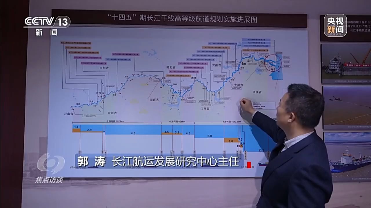 郭涛:十年前,因为局部的堵点卡点,航道标准不能统一,水深没法贯通起来。通过十年的整治和疏浚,水深明显提升了,可以通航的船舶更大了,物流成本就更低了。